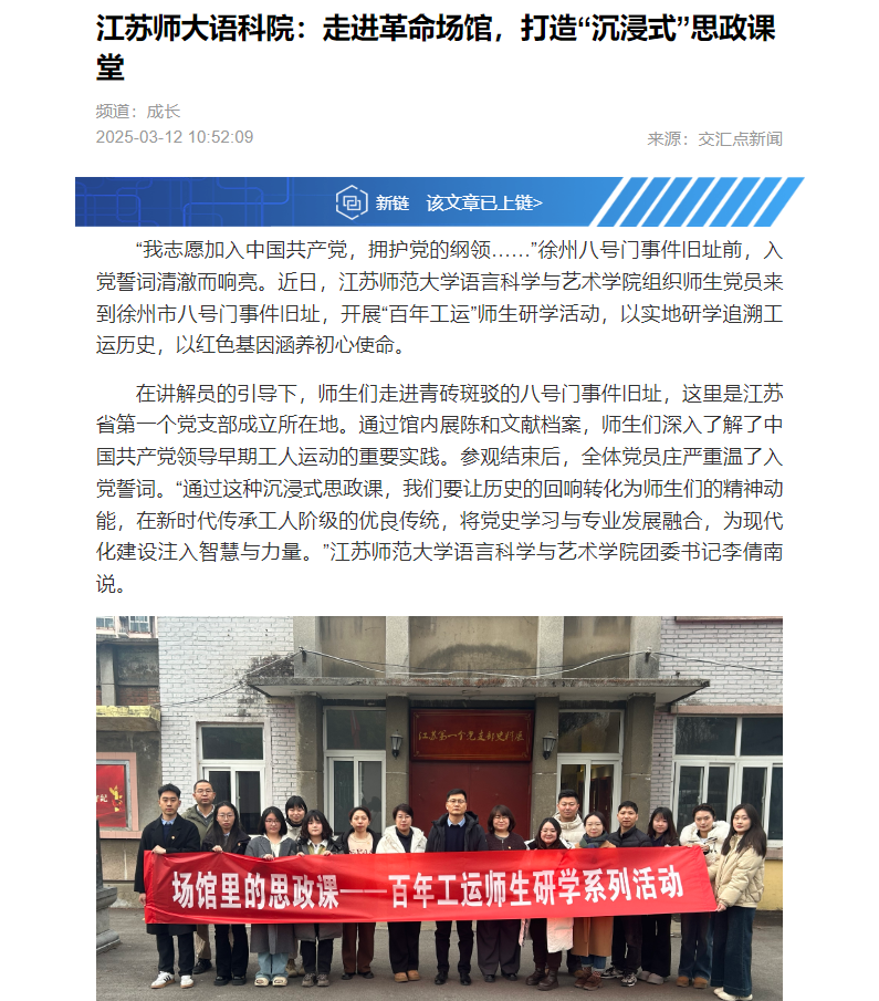 近年來,為引導教育廣大師生堅定理想信念,從黨領導中國工人運動的百年歷史中汲取奮進力量,江蘇師范大學語言科學與藝術學院黨委創新打造“場館里的思政課”品牌,組織師生前往全國青少年井岡山革命傳統教育基地、南京“三浦戰役”史料館、日照抗日戰爭紀念館、徐州淮海戰役紀念館等革命場館,將寶貴的紅色基地轉化為生動的思政課堂資源,讓師生們在身臨其境中得到更深的感悟,在傳承紅色基因中鍛造責任擔當。