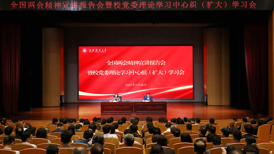 3月26日下午,我校舉辦學(xué)習(xí)貫徹全國兩會(huì)精神宣講報(bào)告會(huì)暨校黨委理論學(xué)習(xí)中心組(擴(kuò)大)學(xué)習(xí)會(huì)。會(huì)議邀請(qǐng)全國人大代表、徐州市云龍區(qū)委書記陳婕作全國兩會(huì)精神宣講報(bào)告,傳達(dá)學(xué)習(xí)習(xí)近平總書記在全國兩會(huì)期間的重要講話精神和全國兩會(huì)精神;邀請(qǐng)江蘇省人民政府原參事、南通大學(xué)原黨委書記成長春作專題報(bào)告,解讀《教育強(qiáng)國建設(shè)規(guī)劃綱要(2024-2035年)》。在校全體校領(lǐng)導(dǎo)、中層干部、校院兩級(jí)黨委理論學(xué)習(xí)中心組全體成員,全體思政課教師,全體輔導(dǎo)員和學(xué)生代表聆聽了報(bào)告。