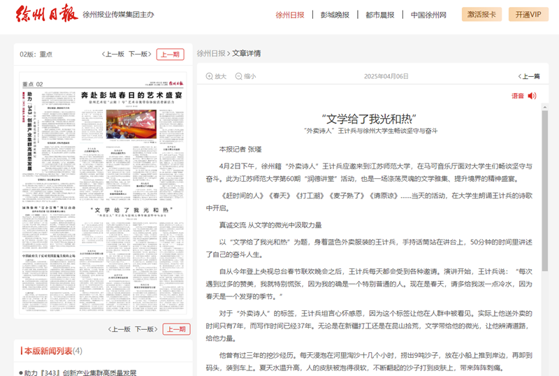 徐州日報4月6日報道我校舉辦的“外賣詩人”王計兵與大學生文學對話活動,報道內容如下: