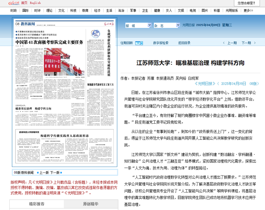 光明日報4月9日以“江蘇師范大學:瞄準基層治理 構建學科方向”為題報道我校公共管理與社會學院以基層治理構建學科方向,報道內容如下: