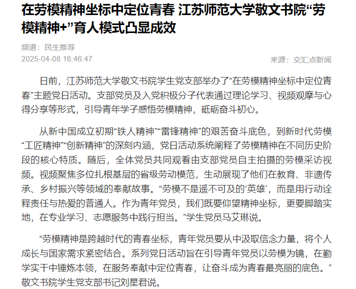 交匯點新聞4月8日報道我校敬文書院勞模精神育人模式,報道內容如下: