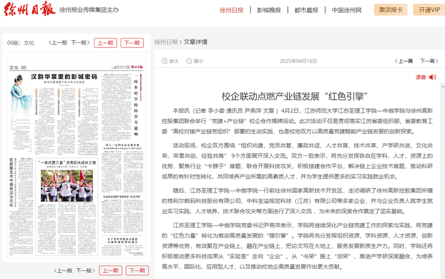 徐州日報4月16日報道我校校企聯(lián)動助推產(chǎn)業(yè)鏈發(fā)展,報道內(nèi)容如下: