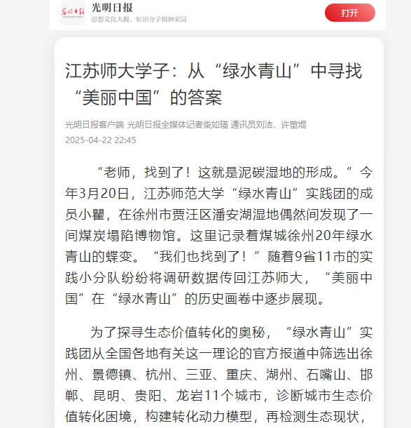“老師,找到了!這就是泥碳濕地的形成。”今年3月20日,江蘇師范大學“綠水青山”實踐團的成員小瞿,在徐州市賈汪區(qū)潘安湖濕地偶然間發(fā)現(xiàn)了一間煤炭塌陷博物館。這里記錄著煤城徐州20年綠水青山的蝶變。“我們也找到了!”隨著9省11市的實踐小分隊紛紛將調(diào)研數(shù)據(jù)傳回江蘇師大,“美麗中國”在“綠水青山”的歷史畫卷中逐步展現(xiàn)。
