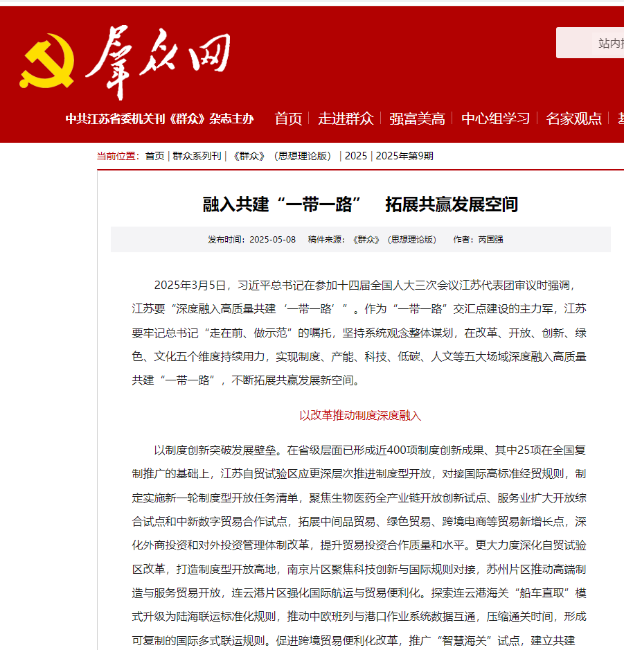 2025年3月5日,習近平總書記在參加十四屆全國人大三次會議江蘇代表團審議時強調,江蘇要“深度融入高質量共建‘一帶一路’”。作為“一帶一路”交匯點建設的主力軍,江蘇要牢記總書記“走在前、做示范”的囑托,堅持系統觀念整體謀劃,在改革、開放、創新、綠色、文化五個維度持續用力,實現制度、產能、科技、低碳、人文等五大場域深度融入高質量共建“一帶一路”,不斷拓展共贏發展新空間。