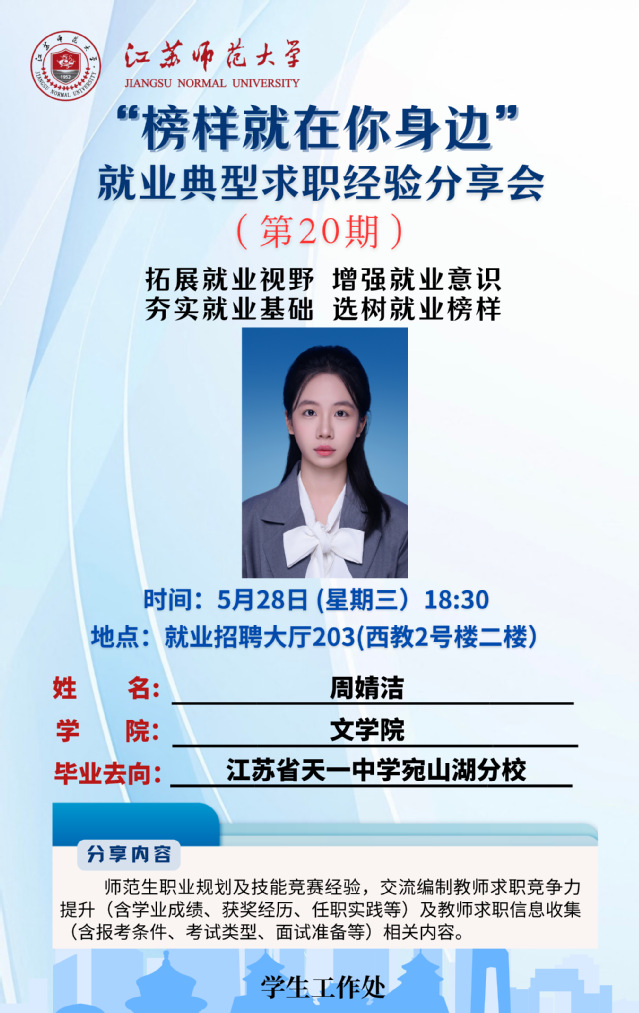 為增強(qiáng)學(xué)生就業(yè)意識(shí),拓寬就業(yè)視野,夯實(shí)就業(yè)基礎(chǔ),學(xué)生工作處結(jié)合學(xué)生關(guān)注度高、求職意愿強(qiáng)烈的行業(yè)領(lǐng)域,開展“榜樣就在你身邊”2025屆畢業(yè)生就業(yè)典型求職經(jīng)驗(yàn)分享系列活動(dòng),充分發(fā)揮朋輩榜樣的示范引領(lǐng)作用,幫助更多的學(xué)生提升就業(yè)競(jìng)爭(zhēng)力。經(jīng)學(xué)院推薦、學(xué)校遴選,現(xiàn)將第二十期活動(dòng)開展相關(guān)情況通知如下: