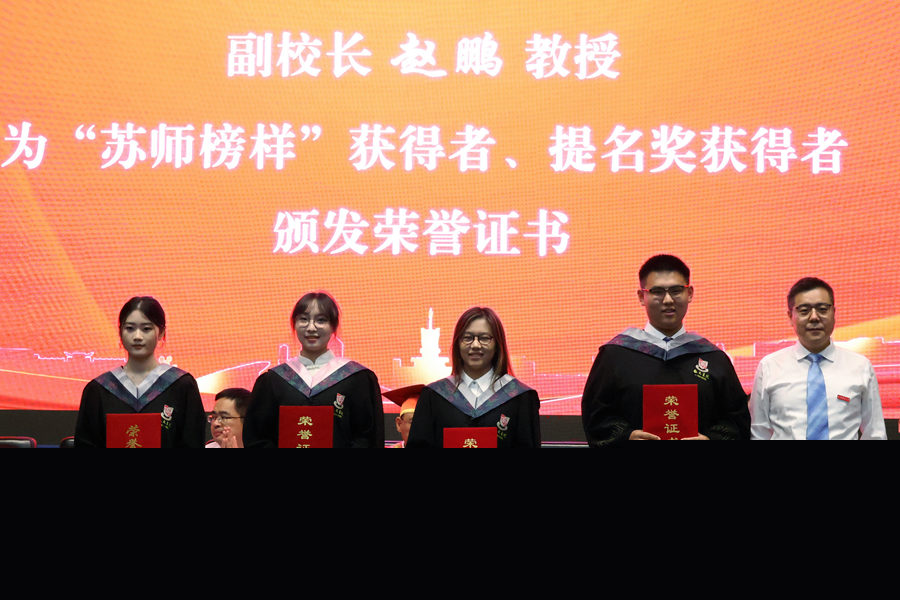 畢業(yè)生代表陶凱文,院友代表張雨欣,家長代表沈永兵,導(dǎo)師代表王興啟在畢業(yè)典禮上發(fā)言。典禮上,表彰了“四星畢業(yè)生”“榮譽(yù)畢業(yè)生”和“優(yōu)秀畢業(yè)生”代表。趙鵬為“蘇師榜樣”獲得者、提名獎獲得者頒獎。