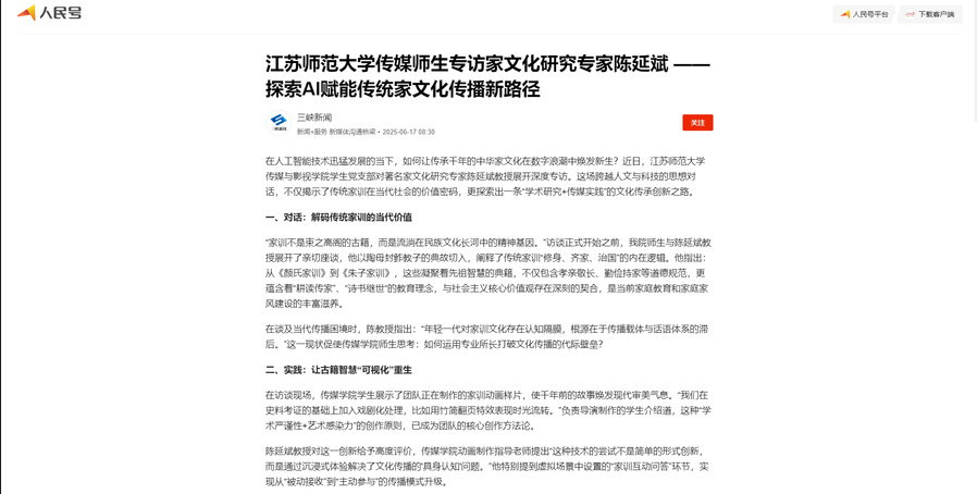 在人工智能技術(shù)迅猛發(fā)展的當(dāng)下,如何讓傳承千年的中華家文化在數(shù)字浪潮中煥發(fā)新生?近日,江蘇師范大學(xué)傳媒與影視學(xué)院學(xué)生黨支部對(duì)著名家文化研究專家陳延斌教授展開深度專訪。這場(chǎng)跨越人文與科技的思想對(duì)話,不僅揭示了傳統(tǒng)家訓(xùn)在當(dāng)代社會(huì)的價(jià)值密碼,更探索出一條“學(xué)術(shù)研究+傳媒實(shí)踐”的文化傳承創(chuàng)新之路。