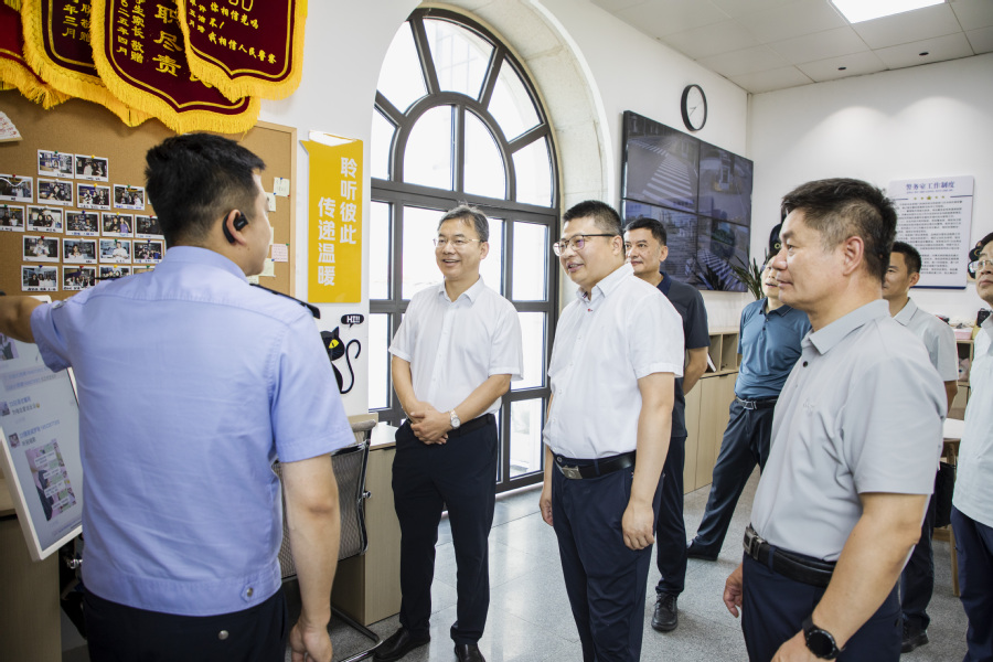 朱國軍先后深入傳達室、警務室、高壓開閉所、消(監)控室、雙創樓、實驗樓、考研教室、大學生活動中心、食堂、校醫院等場所,通過實地查看、翻閱臺賬、聽取匯報等方式,全面檢查治安安全、消防安全、食品安全、暑期值班安排及留校師生生活服務保障等情況。?