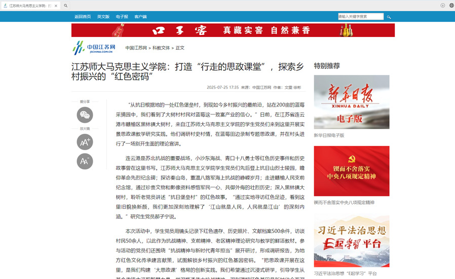 中國江蘇網、交匯點新聞、全國高校思想政治工作網近日關注我校馬克思主義學院暑期社會實踐活動,報道內容如下:
