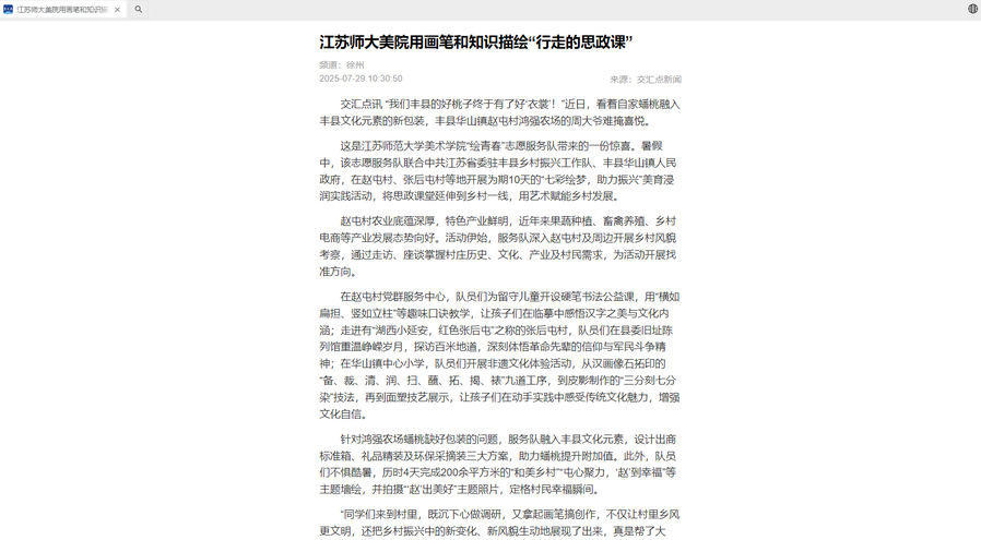 “把專業實踐融入鄉村振興,才是最生動的思政課。”江蘇師大美術學院黨委副書記朱和卿說,從非遺傳承到紅色尋訪,從筆墨傳情到助農設計,師大學子以青春之力探索 “文化+藝術+鄉村”的振興路徑,充分展現新時代青年服務基層的使命擔當。