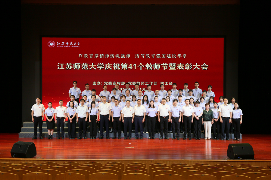 9月10日下午,江蘇師范大學舉辦“以教育家精神鑄魂強師,譜寫教育強國建設華章”為主題的慶祝第41個教師節暨表彰大會。在校全體校領導、江蘇省教育基金會副秘書長張虎成、各學院黨政負責人、機關部門和直屬單位主要負責人、教師代表、接受表彰的先進集體和個人代表、從事教育教學30周年教師代表、退休教師代表、新入職教師和學生代表參加表彰大會。