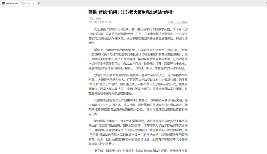 近年來,“幫信罪”作為典型輕罪,已成為社會治理重點。今年7月,“兩高一部”發(fā)布《關(guān)于辦理幫助信息網(wǎng)絡(luò)犯罪活動等刑事案件有關(guān)問題的意見》,指出辦案機關(guān)應(yīng)積極開展法治宣傳教育,推動全社會共同參與治理。江蘇師范大學(xué)組建學(xué)生志愿服務(wù)團隊,自2023年以來,持續(xù)深入江蘇、河南等10個省市,開展“幫信罪”普法宣傳教育,探索出一條“多元協(xié)同、精準(zhǔn)普法”的治理新路徑。
