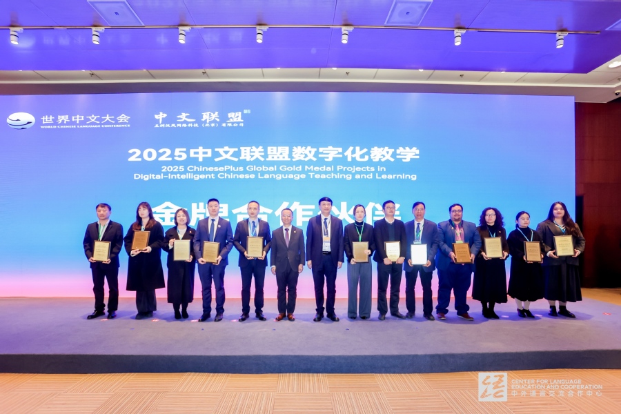 大會成果發(fā)布環(huán)節(jié),杜增吉受邀參加“中文聯盟新平臺”上線啟動儀式并為獲獎代表頒獎。我校獲評“2025全球中文聯盟數智化教學金牌合作伙伴”,我校美國留學生陶海晨榮獲“國際雙語人才中英文演講比賽推廣大使”稱號,并受邀參與展演活動。