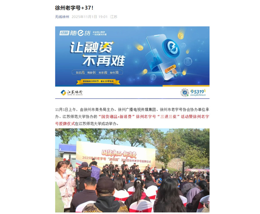 徐州廣電“無線徐州”11月1日報道徐州老字號“三進(jìn)三促”活動暨徐州老字號授牌儀式在江蘇師范大學(xué)成功舉辦,報道內(nèi)容如下: