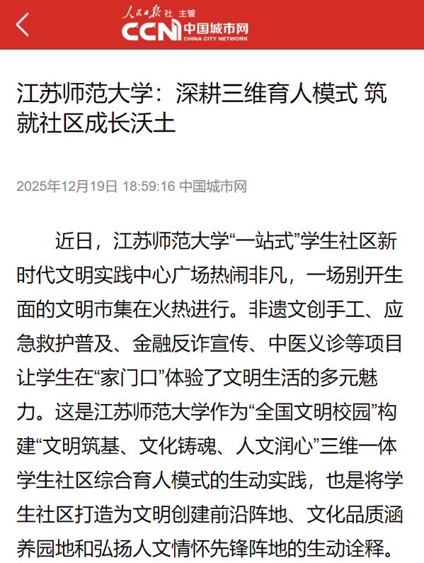 中國城市網(wǎng)、江蘇經(jīng)濟(jì)網(wǎng)12月12日發(fā)表我校“一站式”學(xué)生社區(qū)新時代文明實(shí)踐成果,內(nèi)容如下: