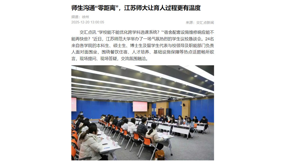 這場懇談會是江蘇師范大學踐行“共商共建共治共享”治理理念的生動縮影。近年來,江蘇師范大學持續深化育人治理改革,建立健全學生意見收集反饋長效機制。通過定期舉辦“校長有約”座談會、學生議事廳等活動,依托校長助理團、一站式學生社區自管會、線上線下意見箱、學生思想動態分析研判會等多元渠道,常態化收集學生訴求。