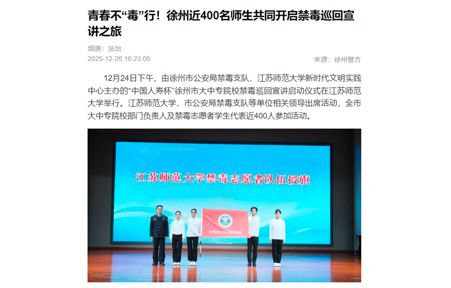 交匯點新聞12月26日發(fā)布我校與徐州市公安局禁毒支隊主辦的禁毒巡回宣講活動,內容如下: