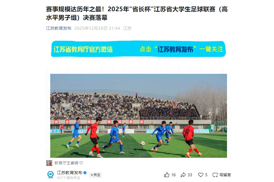 江蘇省教育廳“江蘇教育發布”微信公眾號12月28日關注我校在2025年“省長杯”江蘇省大學生足球聯賽(高水平男子組)決賽中奪冠,內容如下: