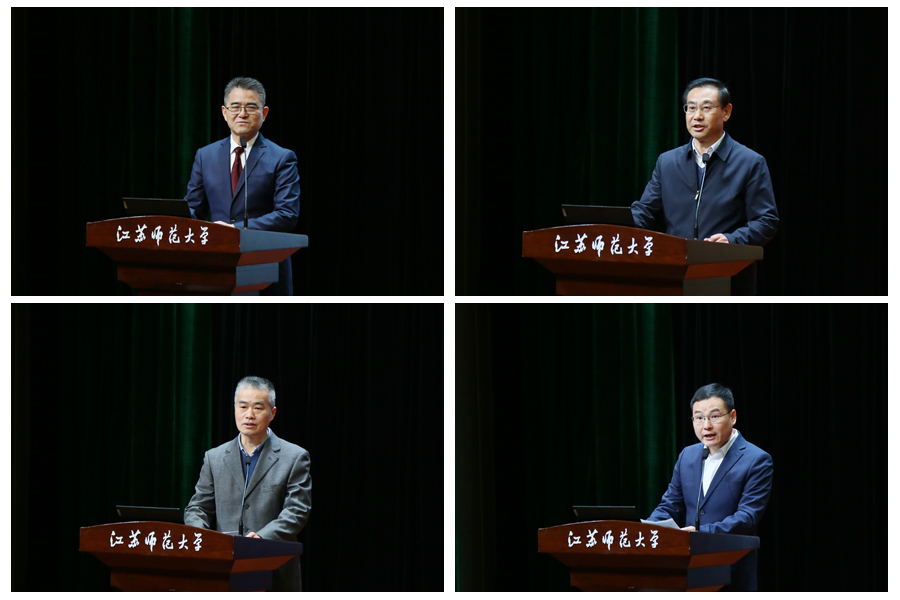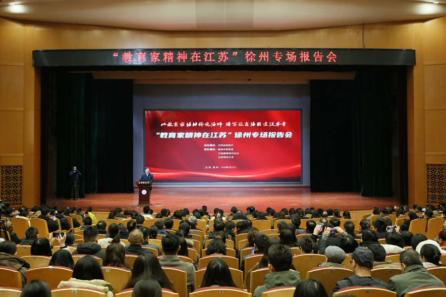 1月13日,“教育家精神在江蘇”徐州專場報告會在我校舉辦。本次報告會旨在深入踐行習近平總書記關于弘揚教育家精神的重要指示精神,讓教育家精神轉化為廣大教師的思想自覺與行動自覺,讓尊師重教的風尚浸潤社會肌理,為譜寫“強富美高”新江蘇現代化建設新篇章筑牢人才根基、凝聚教育力量。江蘇省教育廳副廳長陳艷,江蘇師范大學黨委書記芮國強、校長杜增吉,徐州市教育局局長孫云靜出席活動,省教育廳宣傳中心(江蘇教育報刊總社)、市教育局、在徐高校相關負責人,各縣(市、區)教育(科教)局相關負責人,徐州市各級各類學校教師代表,江蘇師范大學教師代表、師范生代表約400人參加活動。杜增吉主持報告會。
