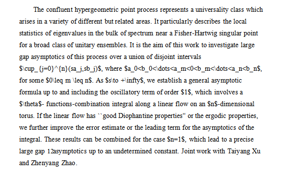 報告題目:Confluent hypergeometric kernel determinant on multiple large intervals