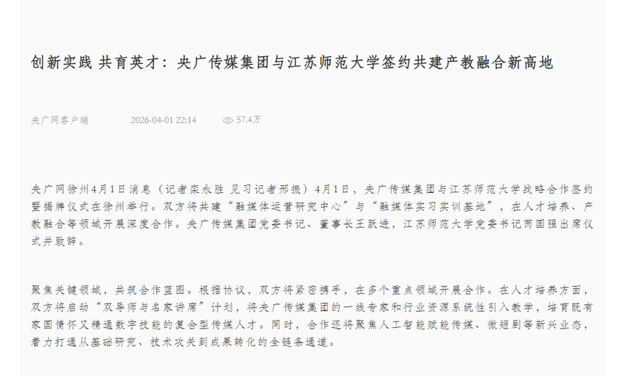 央廣網4月1日報道央廣傳媒集團與江蘇師范大學簽約共建活動,報道內容如下: