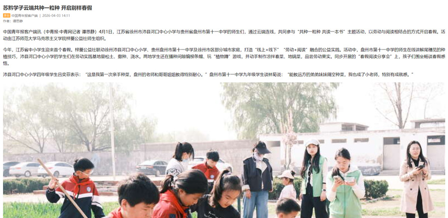 中國青年報客戶端訊(中青報·中青網(wǎng)記者 譚思靜)4月1日,江蘇省徐州市沛縣河口中心小學與貴州省盤州市第十一中學的師生們,通過云端連線,共同參與“共種一粒種 共讀一本書”主題活動,以勞動與閱讀相結合的方式開啟春假。活動由江蘇師范大學馬克思主義學院梓薔公益社師生組織。