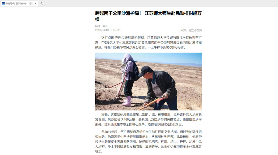 交匯點新聞4月13日關注我校傳媒與影視學院師生赴甘肅民勤開展植樹護綠活動,內(nèi)容如下: