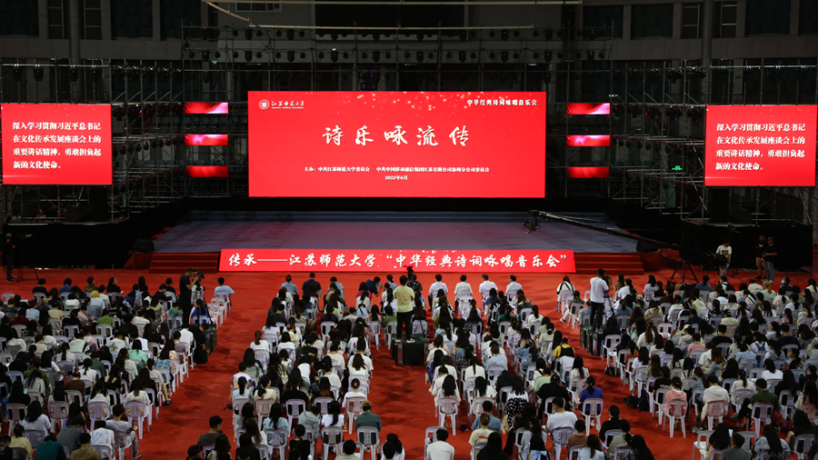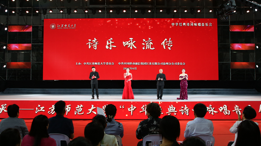 6月19日晚上,由江蘇師范大學(xué)黨委和中國(guó)移動(dòng)江蘇有限公司徐州分公司黨委共同主辦,校黨委宣傳部和音樂(lè)學(xué)院承辦的江蘇師范大學(xué)“詩(shī)樂(lè)詠流傳”中華經(jīng)典詩(shī)詞詠唱音樂(lè)會(huì)在泉山校區(qū)體育館舉行。校黨委副書(shū)記岑紅,校黨委常委、宣傳部部長(zhǎng)孟召學(xué),機(jī)關(guān)各部門(mén)、各學(xué)院黨員干部和師生代表,中國(guó)移動(dòng)徐州分公司代表2000余人觀看了演出。