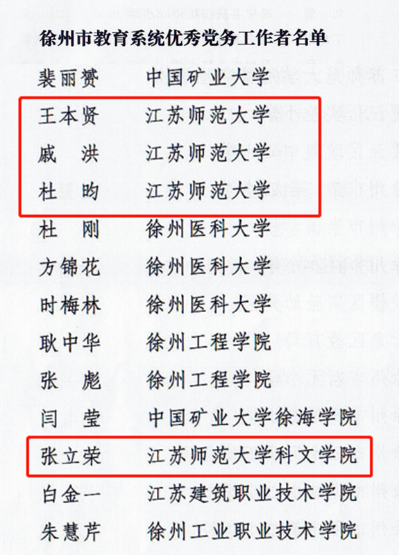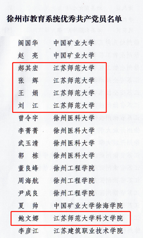 近日,江蘇省委教育工委印發(fā)了《省委教育工委關(guān)于公布江蘇高校2021—2022年度黨建工作創(chuàng)新獎和2022年度最佳黨日活動優(yōu)勝獎評選結(jié)果的通知》(蘇委教組函〔2023〕24號),徐州市委教育工委印發(fā)了《關(guān)于表彰全市教育系統(tǒng)優(yōu)秀共產(chǎn)黨員、優(yōu)秀黨務(wù)工作者、先進(jìn)基層黨組織的決定》(徐委教〔2023〕12號),我校4個基層黨組織獲省委教育工委表彰,4個基層黨組織和9名黨員獲市委教育工委表彰。