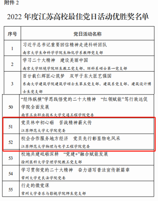 文學(xué)院黨委“黨員林中初心礪 苦戰(zhàn)精神薪火傳”、物理與電子工程學(xué)院黨委“校企合作服務(wù)地方經(jīng)濟(jì) 黨員先行彰顯物電風(fēng)采”獲2022年度江蘇高校最佳黨日活動優(yōu)勝獎,機(jī)關(guān)第二十二黨支部“‘支部在線’推動高校基層黨建工作數(shù)字化轉(zhuǎn)型”獲2021—2022年度江蘇高校黨建工作創(chuàng)新獎二等獎,公共管理與社會學(xué)院政治與公共管理系黨支部、研究生黨支部“口述歷史傳承抗美援朝精神 培根鑄魂夯實黨員信仰之基”獲2021—2022年度江蘇高校黨建工作創(chuàng)新獎三等獎,文學(xué)院黨委、物理與電子工程學(xué)院黨委、機(jī)關(guān)第十五黨支部、科文學(xué)院黨委文理學(xué)院黨總支被授予徐州市教育系統(tǒng)“先進(jìn)基層黨組織”稱號,郝其宏、張輝、王娟(教科)、劉江、鮑文娜(科文)同志被授予徐州市教育系統(tǒng)“優(yōu)秀共產(chǎn)黨員”稱號,王本賢、戚洪、杜昀、張立榮(科文)同志被授予徐州市教育系統(tǒng)“優(yōu)秀黨務(wù)工作者”稱號。