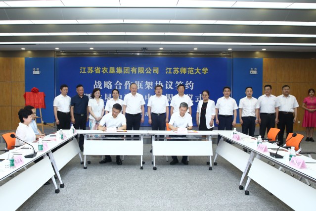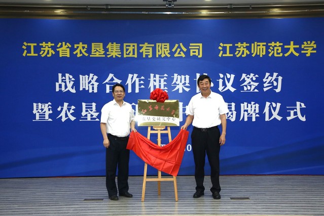 8月10日上午,江蘇省農墾集團有限公司與江蘇師范大學戰略合作框架協議簽約暨農墾史研究中心揭牌儀式在我校舉行,以實際行動貫徹落實習近平總書記考察江蘇重要講話精神,加強優秀傳統文化的保護傳承和創新發展,在建設中華民族現代文明上探索新經驗。江蘇農墾集團黨委書記、董事長魏紅軍,校黨委書記方忠出席并致辭,江蘇農墾集團黨委副書記、總經理胡兆輝與校黨委副書記、校長周汝光共同為江蘇師范大學農墾史研究中心揭牌,江蘇農墾集團黨委副書記姚準明與校黨委常委、副校長蔡國春共同簽署《戰略合作框架協議》,江蘇師范大學農墾史研究中心主任岑紅發言。江蘇農墾集團黨委委員、總會計師劉克英,黨委委員、紀委書記李旭東,副總經理劉耀武,黨委委員、副總經理王立新,黨委委員、工會主席楊義林,江蘇師范大學黨委常委、黨委宣傳部部長孟召學,黨委常委、黨委統戰部部長、黨委辦公室主任商亮出席。江蘇農墾集團總法律顧問、總經理助理、總經濟師和總部各部門主要負責同志,江蘇師范大學黨委教師工作部、人事處兼人才工作辦公室主要負責同志,歷史文化與旅游學院領導班子成員,農墾史研究中心主要研究人員參加。儀式由江蘇師范大學人文社會科學研究院院長婁崢嶸主持。