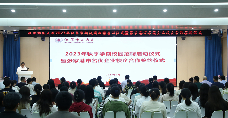 9月5日下午,我校2023年秋季學期校園招聘啟動儀式暨張家港市名優企業校企合作簽約儀式在泉山校區路演大廳舉行。校黨委常委、副校長張玉勤,張家港市人力資源和社會保障局黨委委員、人力資源管理服務中心主任盛宇紅及其相關部門負責人,張家港市24家知名企業人力資源主管,校研究生院、學生工作處相關領導,各學院黨委副書記、就業輔導員,2024屆畢業生代表參加了活動。
