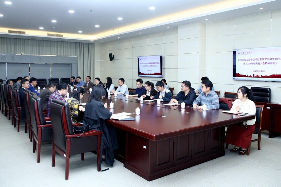 10月30日上午,我校召開學習貫徹習近平總書記重要賀信和歐美同學會成立110周年慶祝大會精神座談會。校黨委副書記蔡國春,校黨委常委、副校長、校歐美同學會會長杜增吉,校黨委常委、組織部部長、統戰部部長黃德志出席會議。會議由校黨委常委、副校長、校歐美同學會副會長趙鵬主持。校歐美同學會秘書長陳健領學了習近平總書記的賀信和歐美同學會成立110周年慶祝大會有關精神。歐美同學會全體理事、會員代表及部分優秀留學歸國人員代表參加座談會。