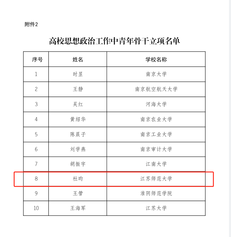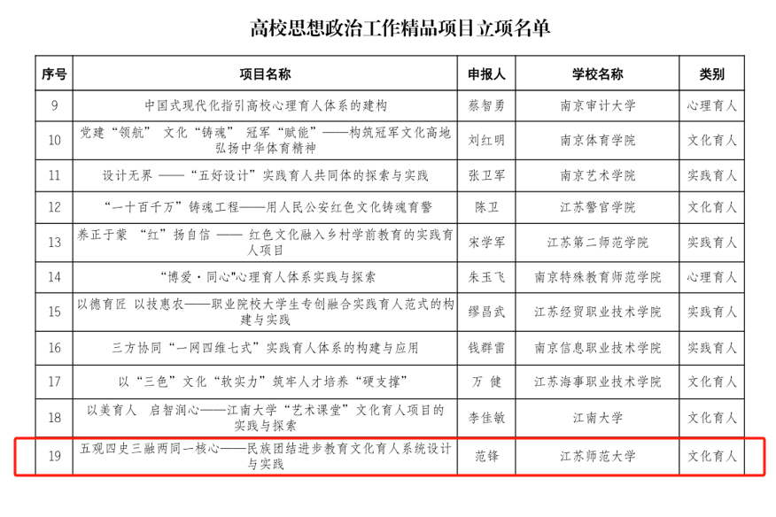 近日,省委教育工委、省教育廳公布了第二批江蘇高校思想政治工作質(zhì)量提升工程有關(guān)建設(shè)項(xiàng)目遴選結(jié)果,我校地理測繪與城鄉(xiāng)規(guī)劃學(xué)院黨委副書記劉潔入選高校網(wǎng)絡(luò)教育名師,敬文書院黨委副書記杜昀入選高校思想政治工作中青年骨干,學(xué)生工作處處長范鋒主持的《“五觀四史三融兩同一核心”——民族團(tuán)結(jié)進(jìn)步教育文化育人系統(tǒng)設(shè)計(jì)與實(shí)踐》入選高校思想政治工作精品項(xiàng)目。學(xué)校獲批項(xiàng)目總數(shù)并列全省高校第一。