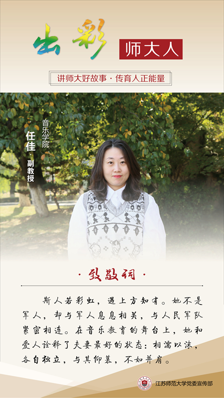 今年建軍節(jié)前夕,在海軍某部舉辦的“強(qiáng)軍當(dāng)先鋒、鮮花送軍嫂”系列活動中,音樂學(xué)院任佳老師脫穎而出,成為受到表彰的十位“最美軍嫂”中的一員。