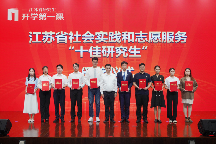 ▲第二屆江蘇省社會實踐和志愿服務十佳研究生頒獎典禮現場(左起五為郝晟)