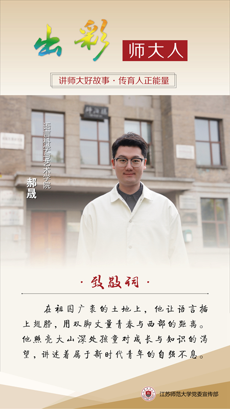 【編者按】千行百業,夢想綻放是謂人生出彩;五湖四海,緣聚于此即為師大一員。在江蘇師范大學,有這樣一批人,他們或于三尺講臺堅守,或于書山學海漫游;或為服務標兵,或為創業典范……身份各異,卻在各自的舞臺上創造精彩,書寫輝煌,共同成就江蘇師大的光榮與夢想。現特推出“出彩師大人”欄目,講述師大人的追夢歷程和出彩故事,展現新時代師大人的卓越風采和獨特氣質,他們是最可親的人,讓我們向他們致敬!