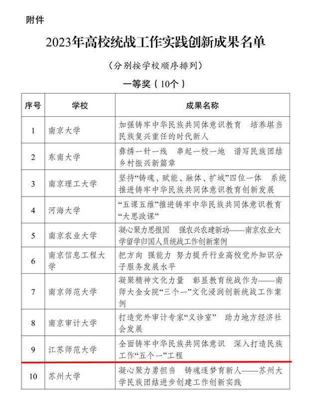 近日,省委教育工委《關(guān)于公布2023年高校統(tǒng)戰(zhàn)工作實(shí)踐創(chuàng)新成果遴選結(jié)果的通知》(蘇委教函〔2023〕26號)公布了全省高校統(tǒng)戰(zhàn)工作實(shí)踐創(chuàng)新成果征集活動(dòng)結(jié)果,我校成果《全面鑄牢中華民族共同體意識 深入打造民族工作“五個(gè)一”工程》榮獲一等獎(jiǎng)。
