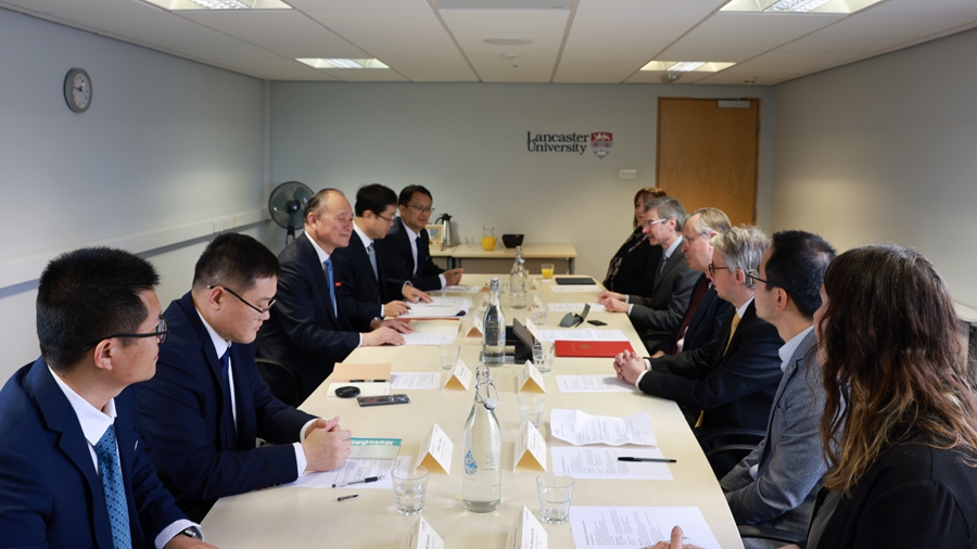 在英國訪問期間,訪問團(tuán)首先來到英國蘭卡斯特大學(xué),與西蒙?蓋常務(wù)副校長圍繞兩校翻譯碩士聯(lián)合培養(yǎng)項(xiàng)目進(jìn)行了會(huì)談。方忠簡要介紹了我校的歷史沿革和發(fā)展近況,尤其是我校翻譯碩士專業(yè)授權(quán)點(diǎn)的師資和人才培養(yǎng)質(zhì)量情況,并表示兩校翻譯碩士聯(lián)合培養(yǎng)項(xiàng)目有助于提升我校翻譯碩士培養(yǎng)質(zhì)量,促進(jìn)英語能力和翻譯技能發(fā)展。西蒙?蓋常務(wù)副校長對方書記一行表示熱烈歡迎,并表示希望在翻譯碩士學(xué)位點(diǎn)建立長期穩(wěn)定且成功的合作。