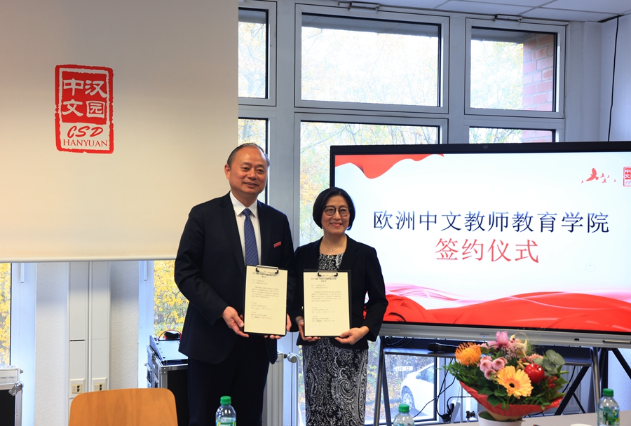 方忠表示,江蘇師范大學(xué)歷來高度重視華文教育,致力于中國語言文化的海外推廣,與漢園中文學(xué)校共建歐洲中文教師教育學(xué)院,實(shí)現(xiàn)歐洲華文教育標(biāo)準(zhǔn)化、正規(guī)化、專業(yè)化和信息化的“四化”目標(biāo),促進(jìn)德國、乃至歐洲華文教育高質(zhì)量發(fā)展,打造新時(shí)代海外華文教育品牌,是雙方的共同目標(biāo),并明確提出江蘇師范大學(xué)未來將會(huì)在線上教師專業(yè)培訓(xùn)、選派優(yōu)秀教師任教、合作開發(fā)優(yōu)質(zhì)教學(xué)資源、開展合作文化研究等四個(gè)方面加強(qiáng)合作,共同辦好中文教師教育學(xué)院。