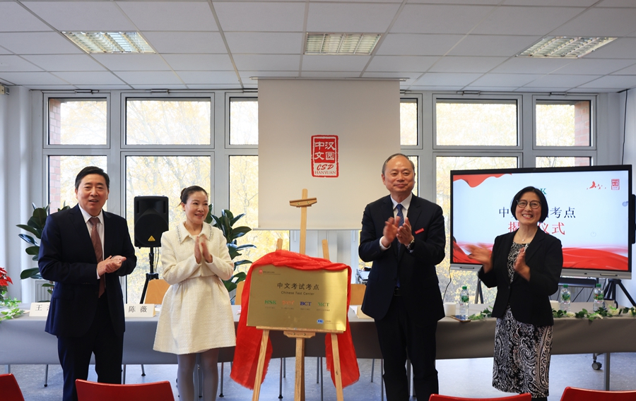 方忠和彭雯共同為漢園中文學(xué)校“中文考試考點(diǎn)”揭牌。方忠表示,江蘇師范大學(xué)在組織漢語水平測試方面經(jīng)驗(yàn)豐富,在江蘇設(shè)有國內(nèi)考點(diǎn),在美國與邁阿密亞裔商務(wù)聯(lián)盟共建考點(diǎn),并連續(xù)兩年被漢考國際評為全球優(yōu)秀海外考點(diǎn),漢園中文學(xué)校“中文考試考點(diǎn)”必將為華文教育發(fā)揮重要作用。