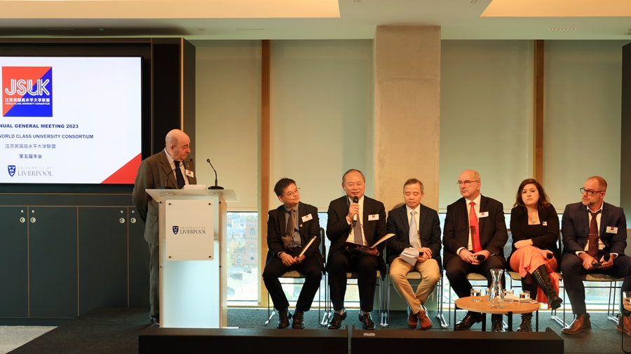 結(jié)束蘭卡斯特的訪問后,代表團(tuán)一行來到英國利物浦大學(xué)并參加2023年江蘇-英國高水平大學(xué)聯(lián)盟年會(huì)暨第五屆國際產(chǎn)學(xué)研合作論壇。16日,訪問團(tuán)聽取了第五屆國際產(chǎn)學(xué)研合作論壇部分專家報(bào)告。17日,訪問團(tuán)參加2023年江蘇-英國高水平大學(xué)聯(lián)盟年會(huì)的全部議程,首先聽取了江蘇和英國雙方聯(lián)盟所作聯(lián)盟工作報(bào)告,隨后,中國駐曼徹斯特總領(lǐng)事唐銳先生、英國文化教育協(xié)會(huì)華東區(qū)主任兼文化教育領(lǐng)事卡特?辛克萊?瓊斯、利物浦市議會(huì)議員尼克?思默、江蘇省教育廳一級巡視員徐子敏、利物浦大學(xué)常務(wù)副校長魏比?泛德?霍克為大會(huì)分別致辭。
