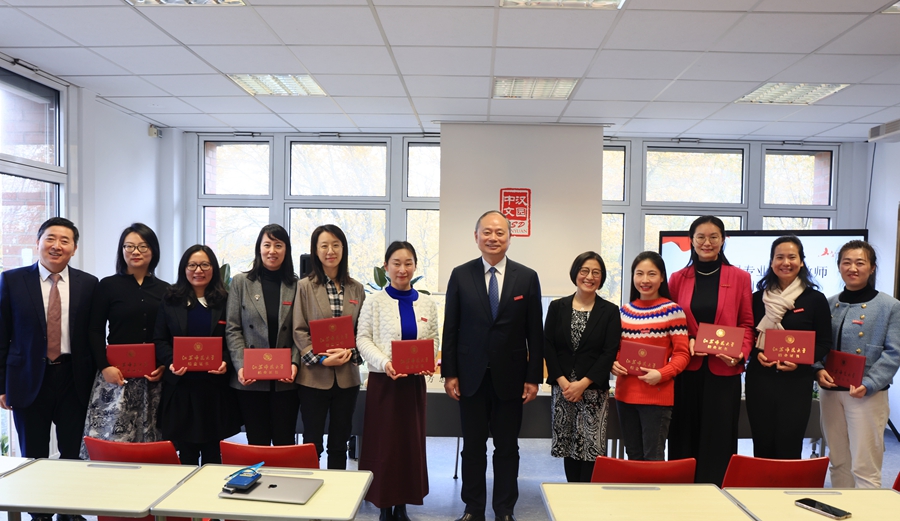 訪問期間,江蘇師范大學(xué)和漢園中文學(xué)校共同舉行了德國首屆專業(yè)中文教師高級別研修班結(jié)業(yè)典禮。方忠為20位學(xué)員頒發(fā)了結(jié)業(yè)證書并佩戴校徽,向他們的順利畢業(yè)表示祝賀,同時(shí)表示江蘇師范大學(xué)永遠(yuǎn)都是校友的堅(jiān)強(qiáng)后盾,期望大家在德國工作順利,努力為歐洲華文教育貢獻(xiàn)力量。最后,江蘇師范大學(xué)成立歐洲校友會(huì)籌備組,校友會(huì)總部設(shè)在德國漢園中文學(xué)校,聘任王杰為歐洲校友會(huì)籌備組主任,方忠對王杰校長在校友會(huì)籌備工作的辛苦付出表示感謝,并希望歐洲校友會(huì)能盡快完成籌備,并發(fā)揮作用。