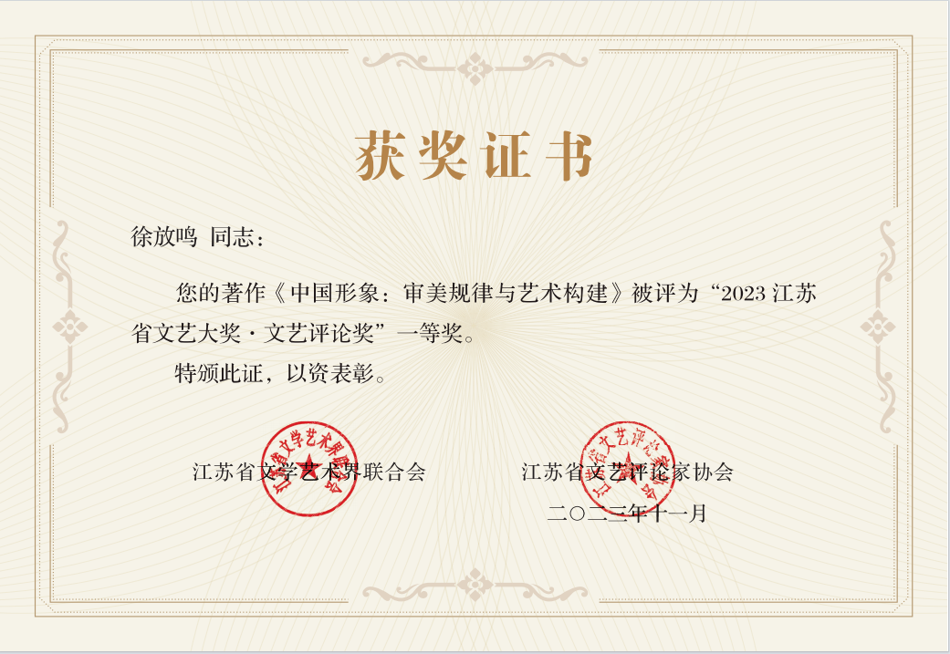 我校文學院徐放鳴教授申報作品《中國形象:審美規律與藝術構建》(徐放鳴等著,高等教育出版社,2023年2月版),榮獲2023年江蘇省文藝大獎·文藝評論獎,位列一等獎第一名。學報編輯部主任呂靖波教授申報作品《一座京昆合璧、美不勝收的戲曲新高峰——評現代昆曲<梅蘭芳·當年梅郎>》(《藝術百家》,2021年第1期),榮獲2023年江蘇省文藝大獎·文藝評論獎三等獎。