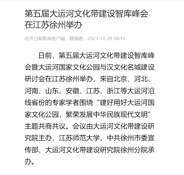 經濟日報客戶端11月29日報道我校承辦的第五屆大運河文化帶建設智庫峰會,報道內容如下:
