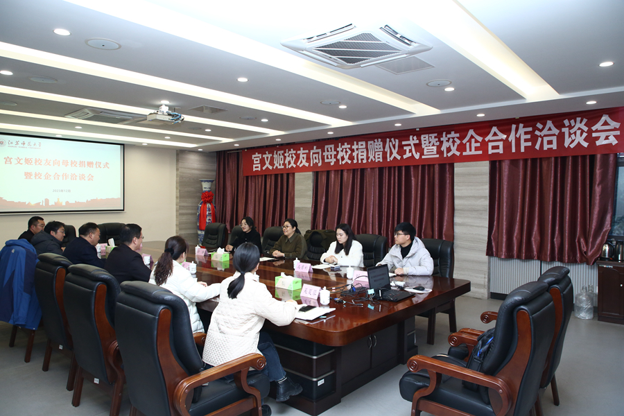 12月5日,宮文姬校友向母校捐贈儀式暨校企合作洽談會在3號樓402會議室舉行。江蘇海文農業發展有限公司董事長宮文姬校友一行,校黨委常委、副校長商亮,校有關職能部門和學院的相關負責同志參加活動。
