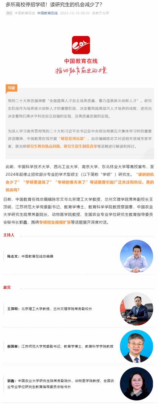 2023年12月16日中國(guó)教育在線以“多所高校停招學(xué)碩!讀研究生的機(jī)會(huì)減少了?”為題,綜合采訪我校黨委副書記蔡國(guó)春等知名教育專家,談研究生招生政策。報(bào)道內(nèi)容如下: