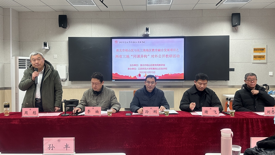 為貫徹落實新課標要求,推動區域教育發展,促進優勢互補和智慧共享,助力教師共同發展,12月15日,江蘇師范大學附屬相山實驗學校舉行“聚焦核心素養,打造靈動課堂”——兩省三地“同課異構”對外公開教研活動暨淮北市相山區與長三角地區教育融合發展論壇。淮北市相山區教育局黨委書記、局長孫剛、淮北市教育局教研室主任謝飛、淮北市相山區教育局黨委委員、淮北市太陽城學校校長孫豐、淮北市相山區教育局教研室主任丁正文、江蘇師范大學附屬學校總校校長周慰、總校督學吳健等出席活動。