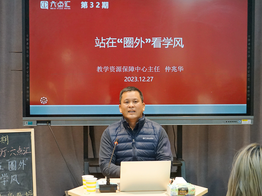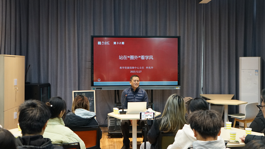 近日,第32期“餐廳·六點(diǎn)匯”活動(dòng)在泉山校區(qū)六點(diǎn)匯實(shí)踐基地舉行。教學(xué)資源保障中心主任仲兆華以“站在‘圈外’看學(xué)風(fēng)”這一主題與在場(chǎng)同學(xué)進(jìn)行交流。