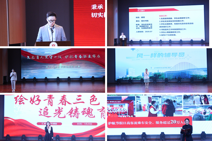 經輔導員個人申報、學院推薦、考核領導小組材料審核等環節,全校共有18名輔導員進入優秀輔導員現場展評環節。會上,參評輔導員圍繞履職情況、工作理念、工作成效等方面進行了匯報,講述了與學生同心同向共同奔赴成長之路的故事;解讀了輔導員作為擺渡人永葆初心的重要意義;介紹了自己助力學生成長成才的工作經驗;匯報了結合專業特色點燃精準育人思政炬火的創新做法……風采展評展示了各位輔導員的育人故事,贏得了現場評委和觀眾的強烈共鳴和陣陣掌聲。會上,輔導員們也帶來了精彩的歌曲、器樂、舞蹈等節目。